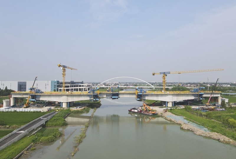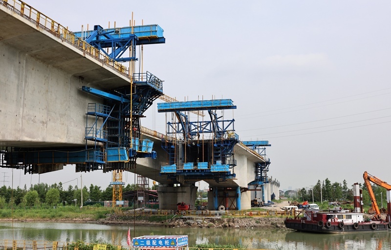 8月12日拍攝的滬寧合高鐵上海特大橋跨羅蘊(yùn)河連續(xù)梁施工現(xiàn)場(chǎng)(無(wú)人機(jī)照片)。