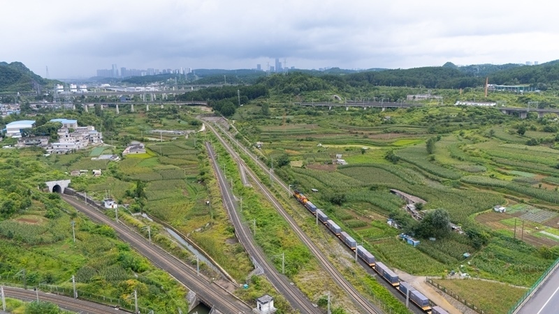 8月19日,貴州首趟多式聯(lián)運(yùn)“一單制”班列駛出貴陽國際陸港都拉營站(無人機(jī)照片)。