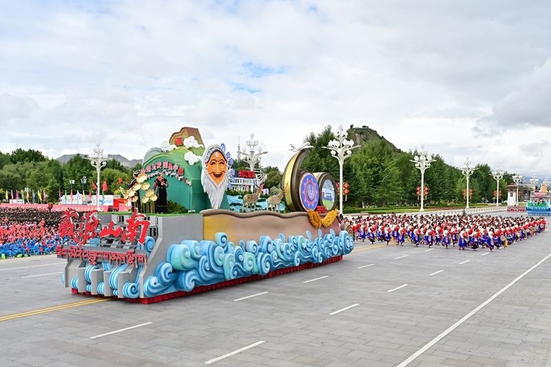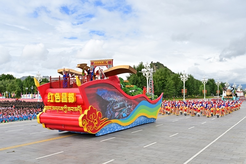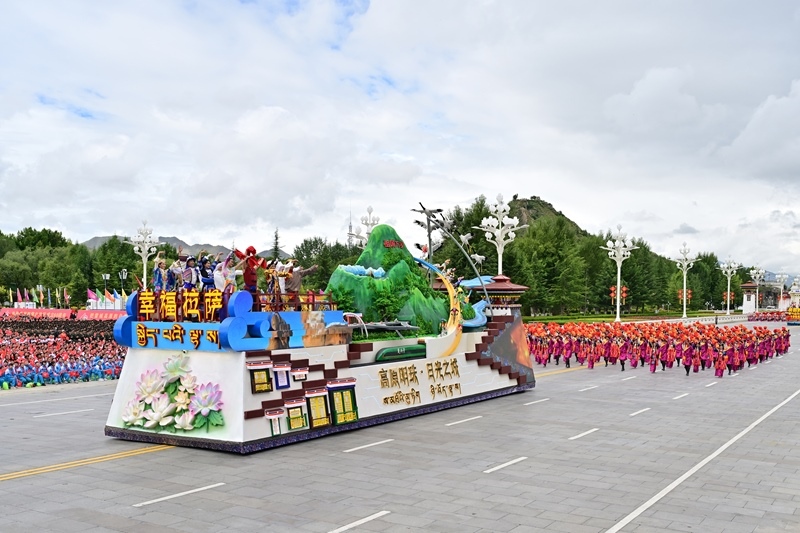 8月21日上午,西藏各族各界干部群眾約2萬人歡聚拉薩市布達(dá)拉宮廣場(chǎng),熱烈慶祝西藏自治區(qū)成立60周年。這是游行的彩車通過布達(dá)拉宮廣場(chǎng)。