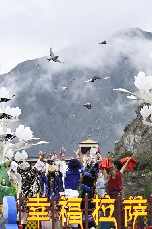 8月21日上午,西藏各族各界干部群眾約2萬人歡聚拉薩市布達(dá)拉宮廣場(chǎng),熱烈慶祝西藏自治區(qū)成立60周年。這是彩車上的演員通過布達(dá)拉宮廣場(chǎng)時(shí)放飛鴿子。