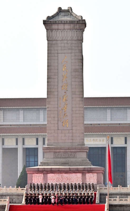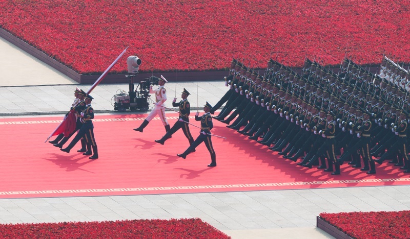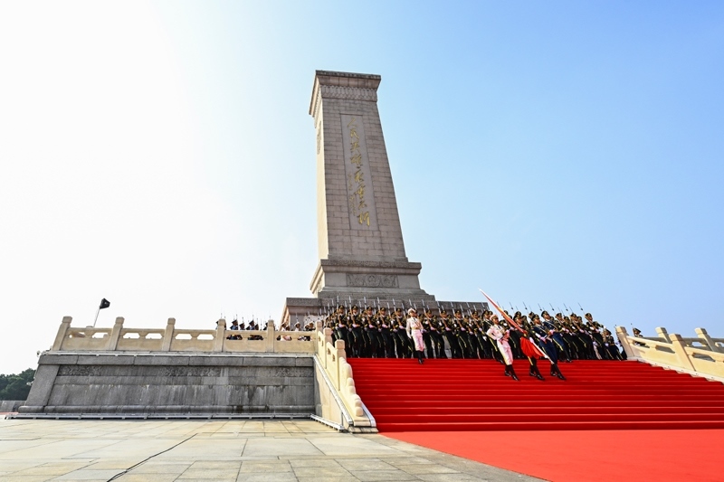 9月3日,紀(jì)念中國人民抗日戰(zhàn)爭暨世界反法西斯戰(zhàn)爭勝利80周年大會在北京隆重舉行。這是國旗護(hù)衛(wèi)隊從人民英雄紀(jì)念碑基座出發(fā),走向旗桿基座。