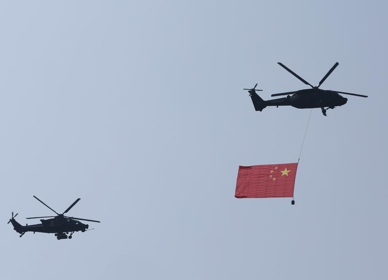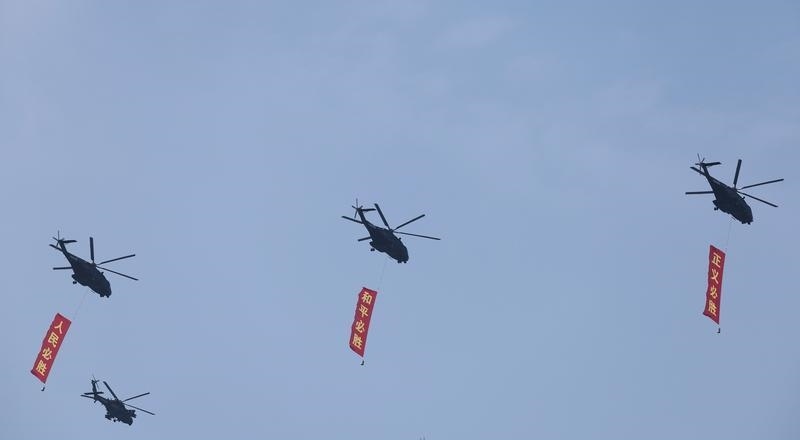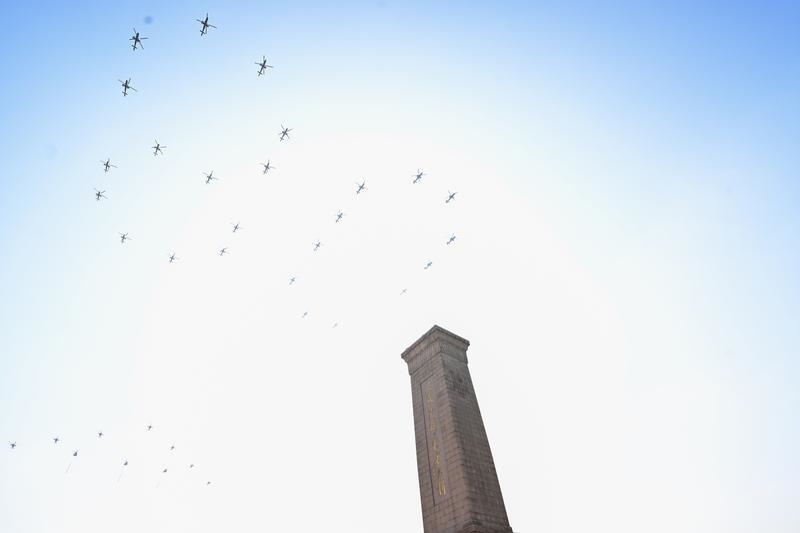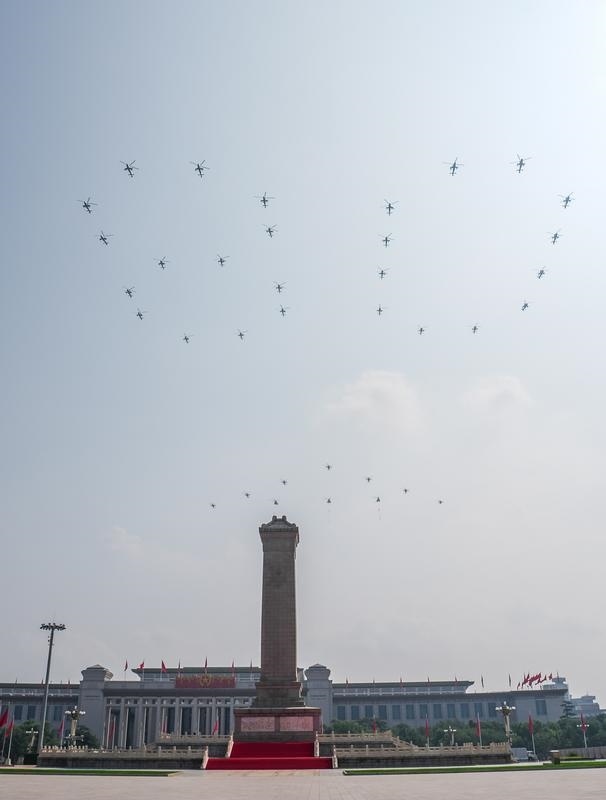 9月3日,紀(jì)念中國人民抗日戰(zhàn)爭暨世界反法西斯戰(zhàn)爭勝利80周年大會(huì)在北京隆重舉行。這是空中護(hù)旗梯隊(duì)飛過天安門廣場上空,26架直升機(jī)匯成巨大的“80”字樣。