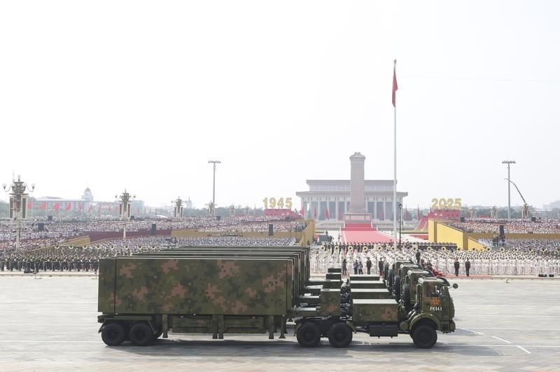 9月3日,紀(jì)念中國人民抗日戰(zhàn)爭暨世界反法西斯戰(zhàn)爭勝利80周年大會在北京隆重舉行。這是反艦導(dǎo)彈方隊接受檢閱。