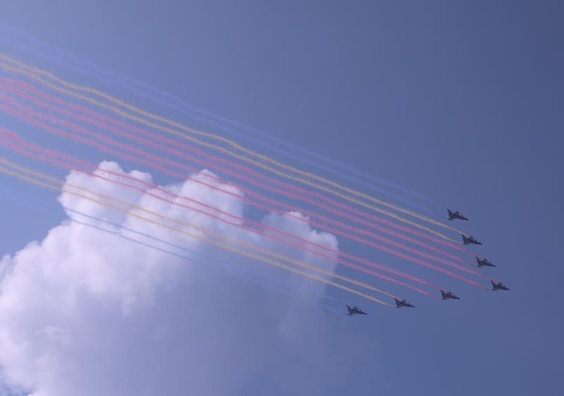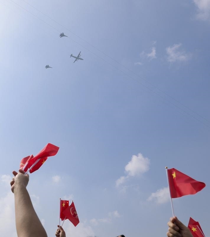 9月3日,紀(jì)念中國人民抗日戰(zhàn)爭暨世界反法西斯戰(zhàn)爭勝利80周年大會在北京隆重舉行。這是教練機(jī)梯隊接受檢閱。