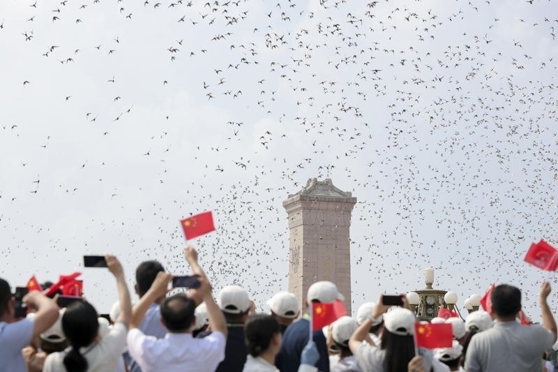 9月3日,紀(jì)念中國人民抗日戰(zhàn)爭暨世界反法西斯戰(zhàn)爭勝利80周年大會在北京隆重舉行。這是紀(jì)念大會現(xiàn)場放飛鴿子。