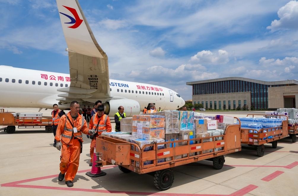 這是2025年4月19日在昆明長(zhǎng)水機(jī)場(chǎng)拍攝的中國(guó)政府援緬衛(wèi)生防疫隊(duì)攜帶的物資。新華社記者 陳欣波 攝