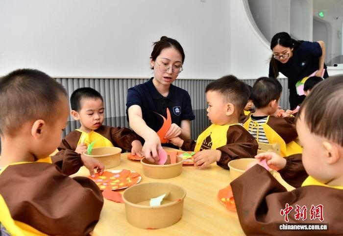 7月29日,福州新星托育園東街園老師指導(dǎo)小朋友進(jìn)行藝術(shù)創(chuàng)想,制作美味的“披薩”。近年來,當(dāng)?shù)胤e極推動公辦幼兒園和社會力量興辦發(fā)展托育教育服務(wù),以解決民眾“帶娃難”的問題。 中新社記者 張斌 攝