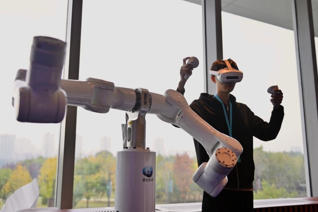 10月17日,在廣東天機智能系統(tǒng)有限公司展臺,工作人員演示“全力控高精度人形臂Marvin”展品。新華社記者 吳青昊 攝