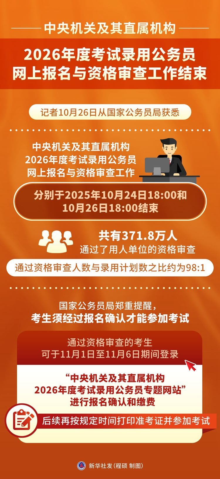 國(guó)家公務(wù)員局鄭重提醒,考生須經(jīng)過(guò)報(bào)名確認(rèn)才能參加考試。通過(guò)資格審查的考生可于11月1日至11月6日期間,登錄“中央機(jī)關(guān)及其直屬機(jī)構(gòu)2026年度考試錄用公務(wù)員專題網(wǎng)站”進(jìn)行報(bào)名確認(rèn)和繳費(fèi),后續(xù)再按規(guī)定時(shí)間打印準(zhǔn)考證并參加考試。