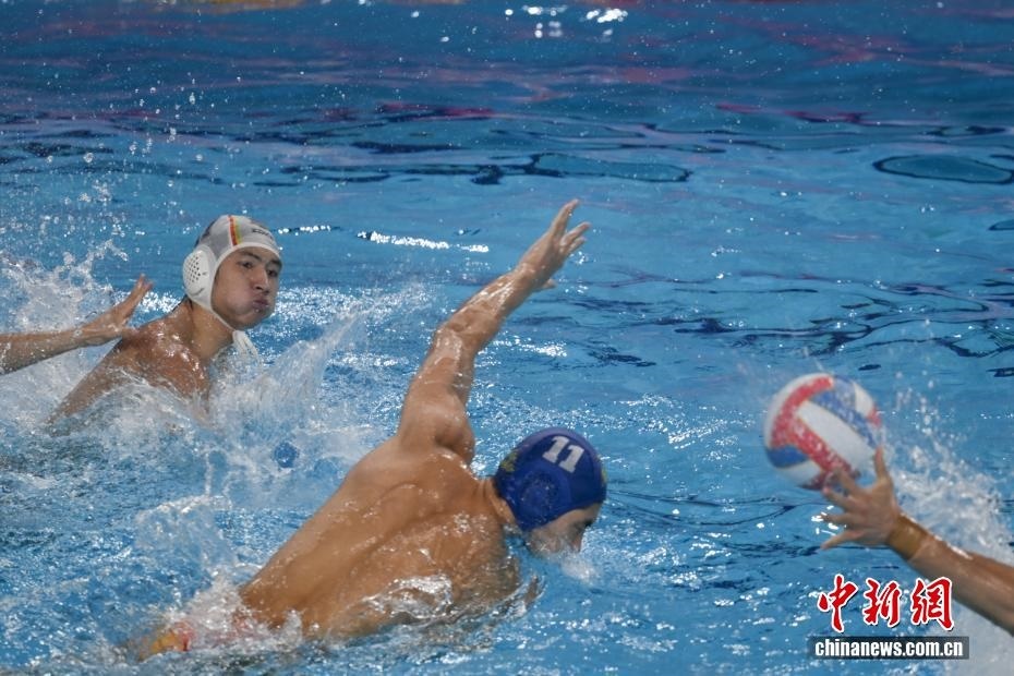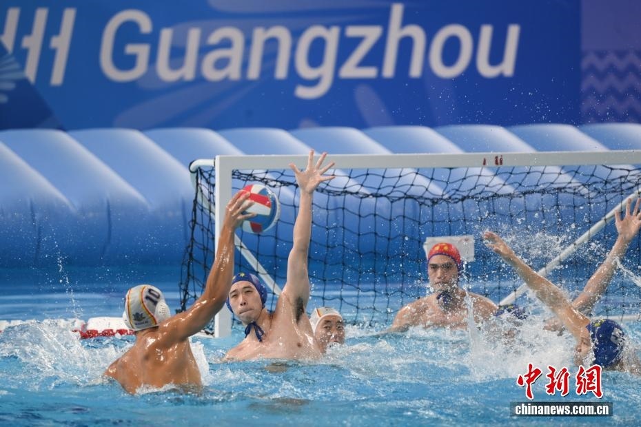 10月27日晚,在廣東廣州舉行的第十五屆全國(guó)運(yùn)動(dòng)會(huì)水球男子組比賽金牌賽中,廣東隊(duì)以16比9戰(zhàn)勝上海隊(duì),獲得金牌。圖為上海隊(duì)11號(hào)運(yùn)動(dòng)員蔡宇浩(白帽)在比賽中進(jìn)攻。