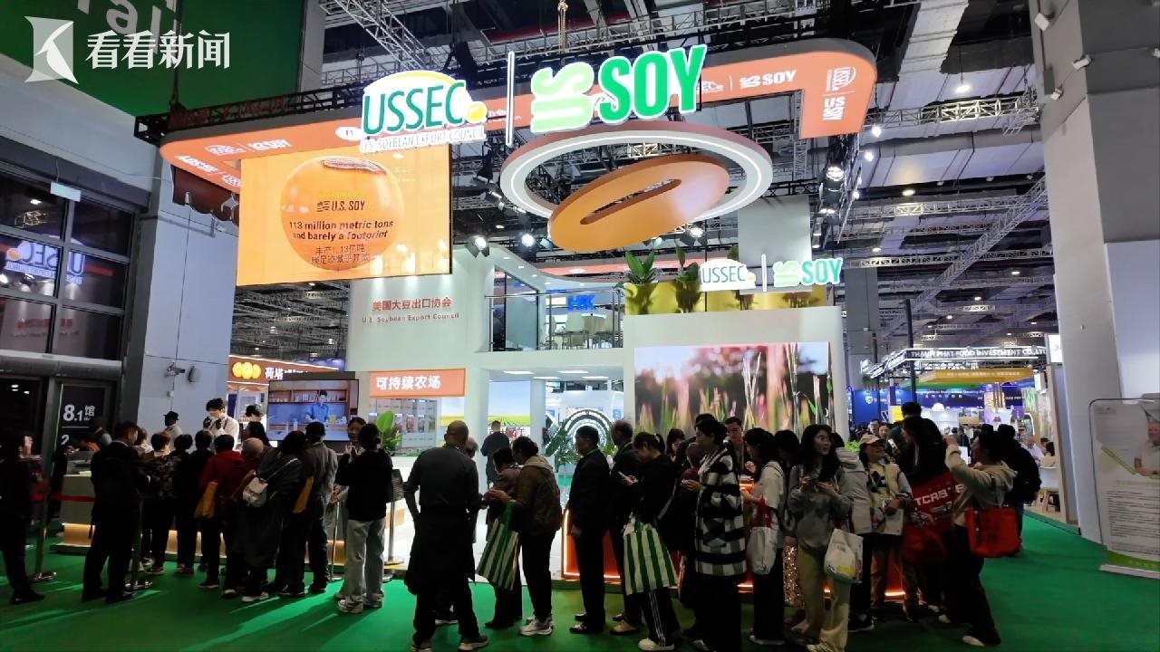 蘇健說的不是客套話。進博會一開始,他的行程就滿滿當當——開館剪彩、客商對接、媒體專訪。他的身后,是一群帶著中文名片、中文宣傳資料的豆農(nóng),賣力帶貨?!罢绱蠹以诂F(xiàn)場看到的,我們可以把大豆加工成大豆油,這種油品更適合高溫烹飪?!泵绹罐r(nóng)蓋思凱說。