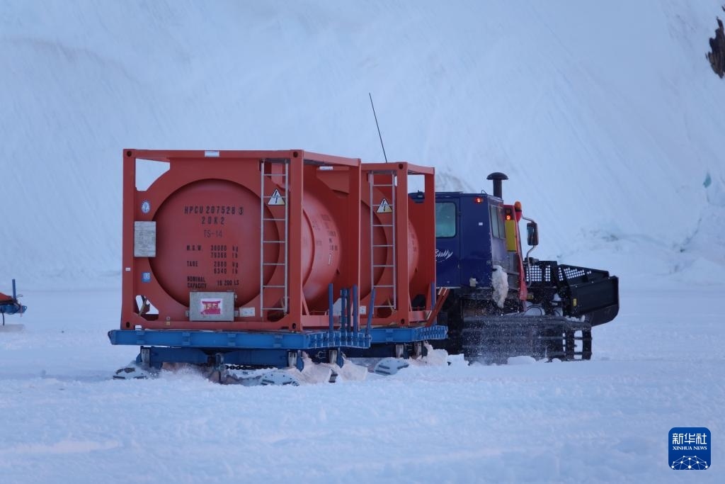 北京時(shí)間12月3日凌晨,雪地車?yán)訚M燃油的油罐離開(kāi)“雪龍2”號(hào),駛向中山站。新華社記者 顧天成 攝