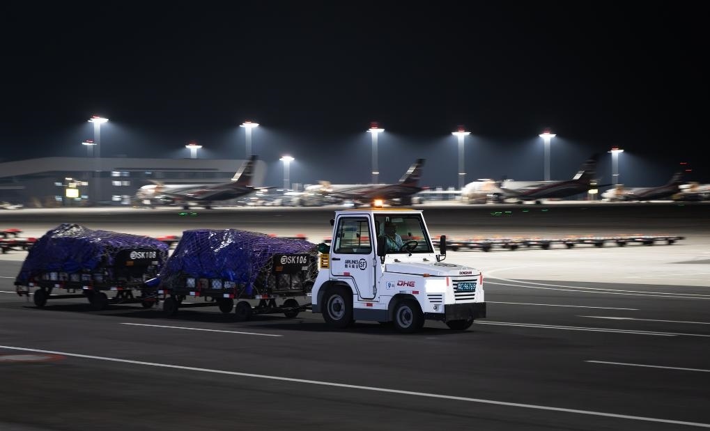 子夜時分,記者驅(qū)車來到這座機場時,撲面而來的是一派“不夜空港”的繁忙景象:雪亮的停機坪上,貨機剛一停穩(wěn),工作人員便操控牽引車、加油車、轉(zhuǎn)運車簇?fù)矶?,卸貨、加油、檢查,井井有條,一刻也不耽誤。