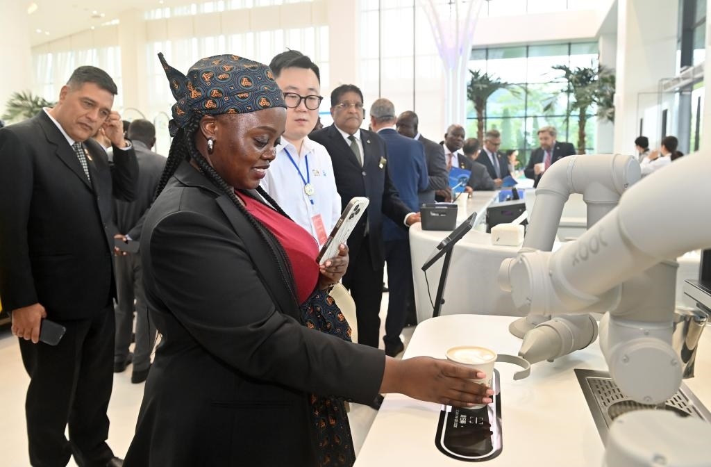 10月29日,駐華使節(jié)代表團在中國-東盟國家人工智能應(yīng)用合作中心參觀體驗機器人制作咖啡。新華社記者 陸波岸 攝