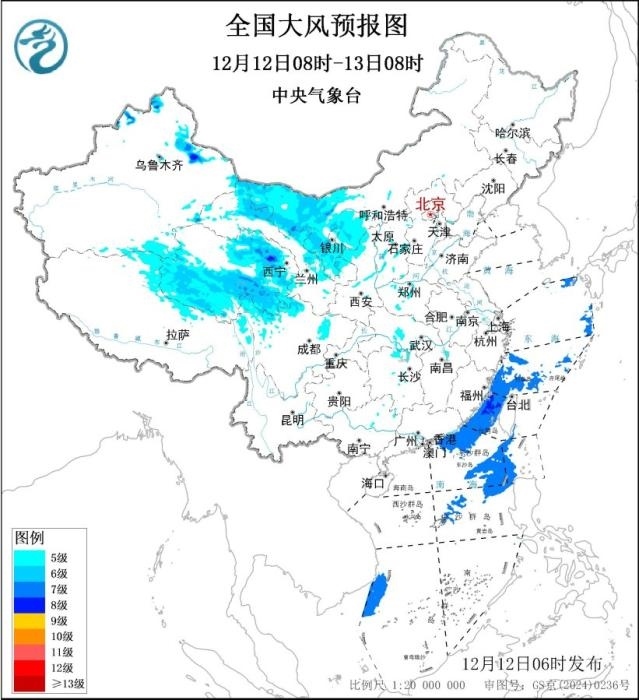 此外,12月12日08時至13日08時,新疆北部、青海、西藏北部、內(nèi)蒙古西部、四川北部、甘肅東部、寧夏、陜西西北部等地部分地區(qū)有5~7級、陣風8~9級的大風,其中,新疆山口地區(qū)陣風可達10~11級;東海南部部分海域、臺灣海峽、巴士海峽、南海東北部和中東部部分海域將有7級、陣風8~9級的大風。中央氣象臺12月12日06時繼續(xù)發(fā)布大風藍色預警。
