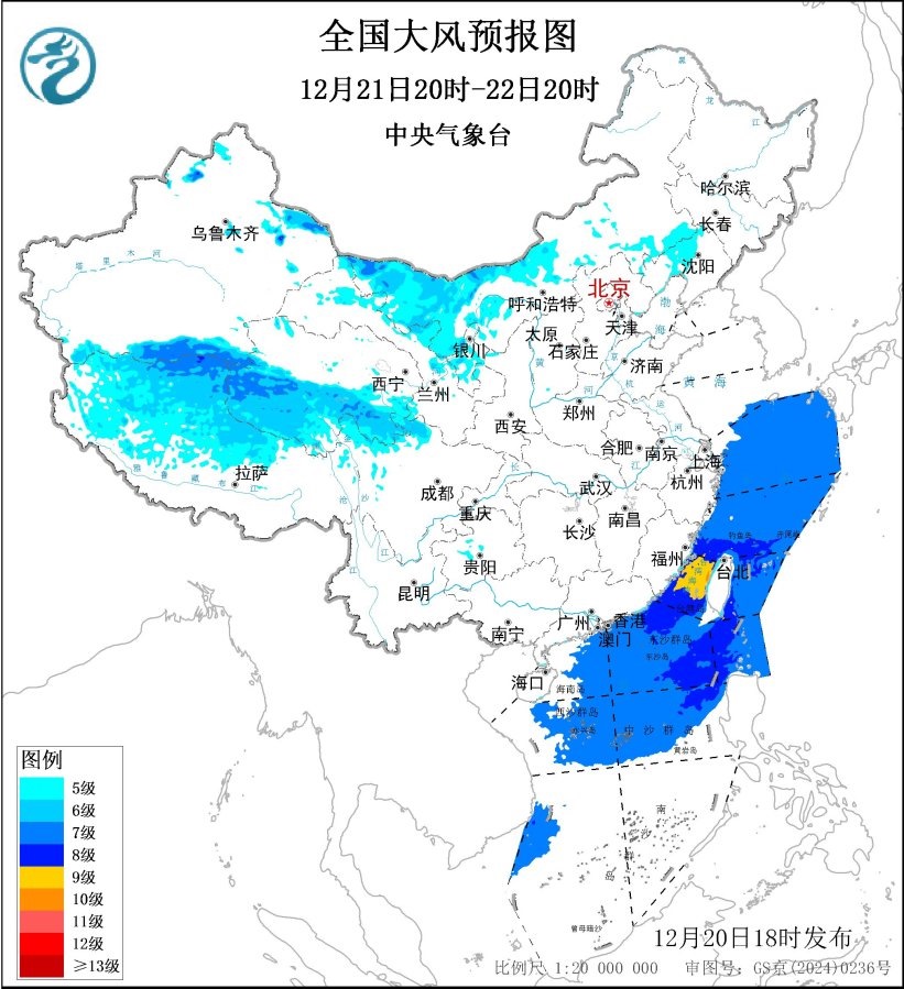 12月21日20時至22日20時,內蒙古中西部、東北地區(qū)南部、華北北部、新疆北疆東部、西藏北部、青海中南部等地有5~6級風,陣風7~9級;東海大部海域、臺灣海峽、臺灣以東洋面、巴士海峽、南海北部和中部海域將有7~8級、陣風9~10級的大風,其中臺灣海峽的風力可達9級、陣風10~11級。