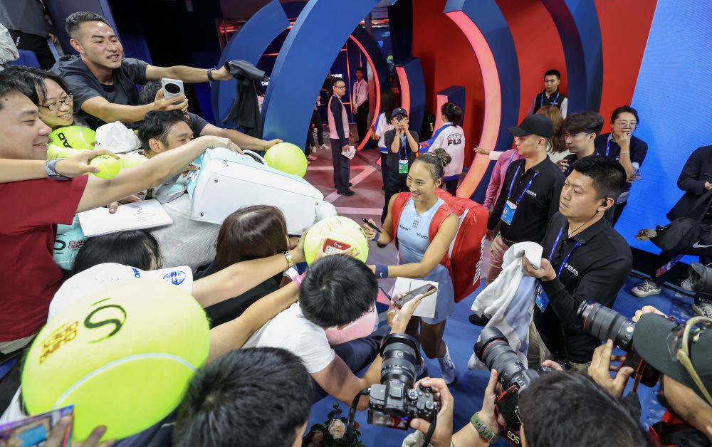 9月27日,在北京舉行的2025中國(guó)網(wǎng)球公開賽女單第二輪與哥倫比亞選手阿朗戈的比賽后,中國(guó)選手鄭欽文(中)與觀眾互動(dòng)。新華社記者 白雪飛 攝
