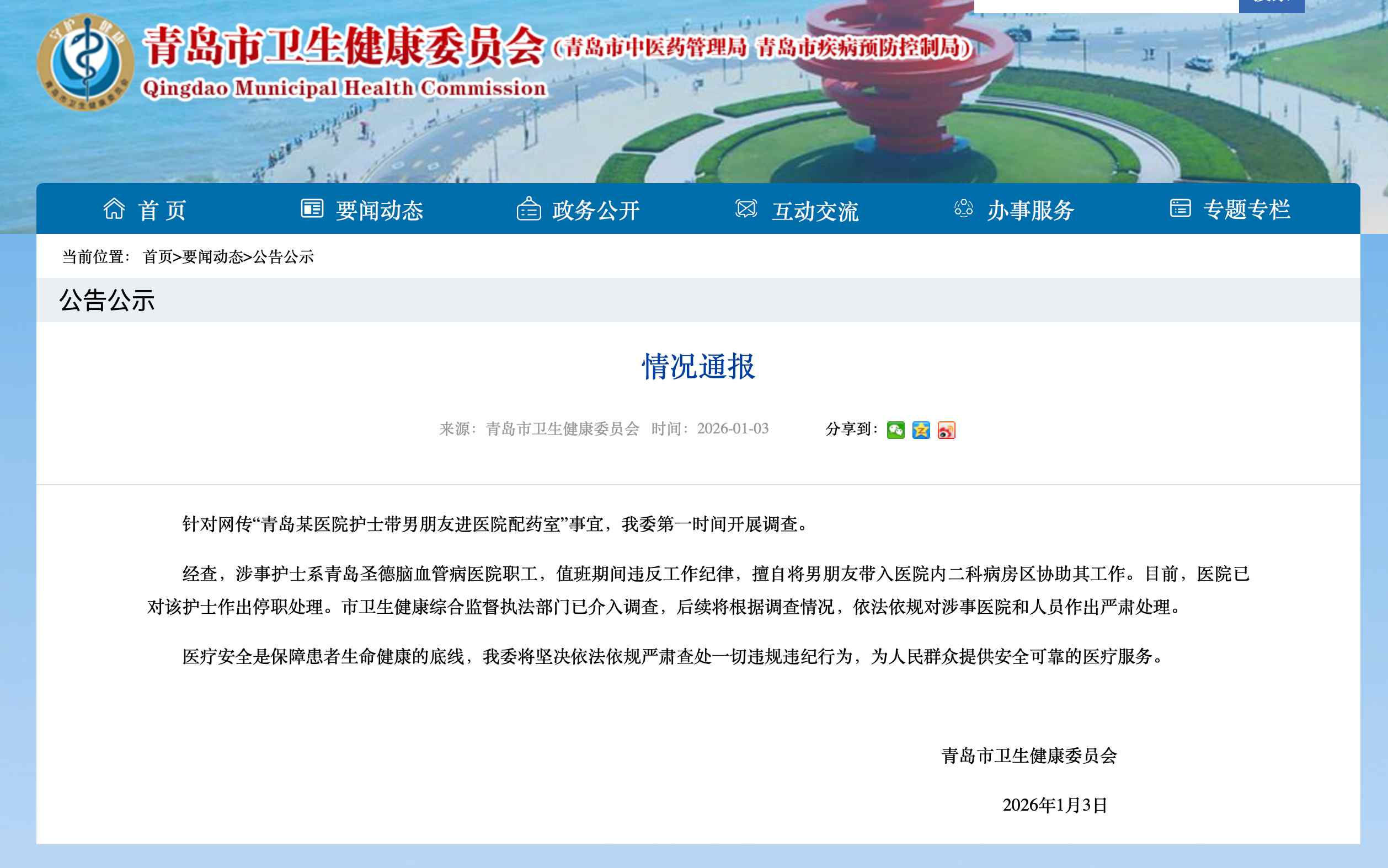 中國網(wǎng)1月3日訊 1月3日,青島市衛(wèi)生健康委員會發(fā)布情況通報:針對網(wǎng)傳“青島某醫(yī)院護士帶男朋友進醫(yī)院配藥室”事宜,青島市衛(wèi)生健康委第一時間開展調(diào)查。