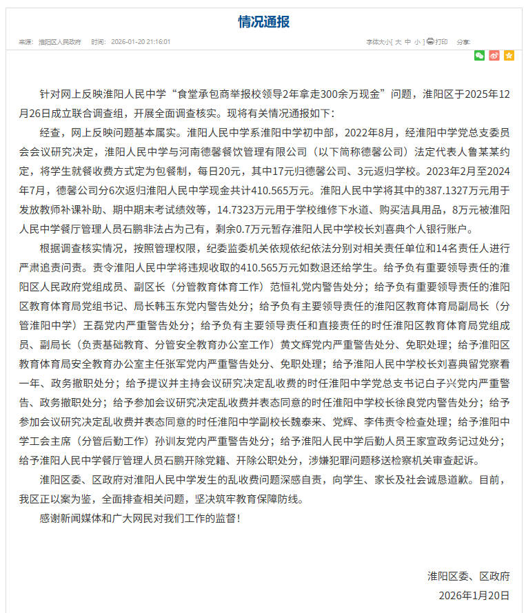 中新網(wǎng)1月21日電 據(jù)周口市淮陽區(qū)人民政府官網(wǎng)消息,近日,淮陽區(qū)委、區(qū)政府發(fā)布通告表示,針對網(wǎng)上反映淮陽人民中學(xué)“食堂承包商舉報校領(lǐng)導(dǎo)2年拿走300余萬現(xiàn)金”問題,淮陽區(qū)于2025年12月26日成立聯(lián)合調(diào)查組,開展全面調(diào)查核實?,F(xiàn)將有關(guān)情況通報如下: