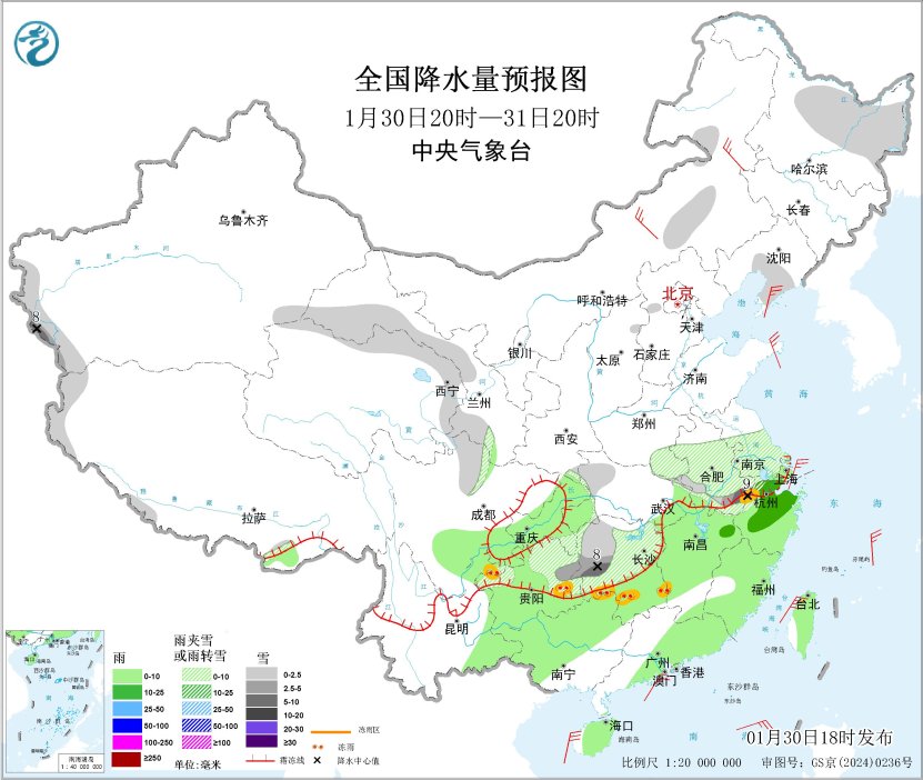 受冷暖空氣共同影響,30日夜間至31日,江漢西部、江淮、江南東北部和西北部及貴州東北部等地有小到中雪或雨夾雪,安徽南部和湖南西部等地局地有大雪,高海拔山區(qū)局地有凍雨;西南地區(qū)東部、江南、華南等地有小到中雨。