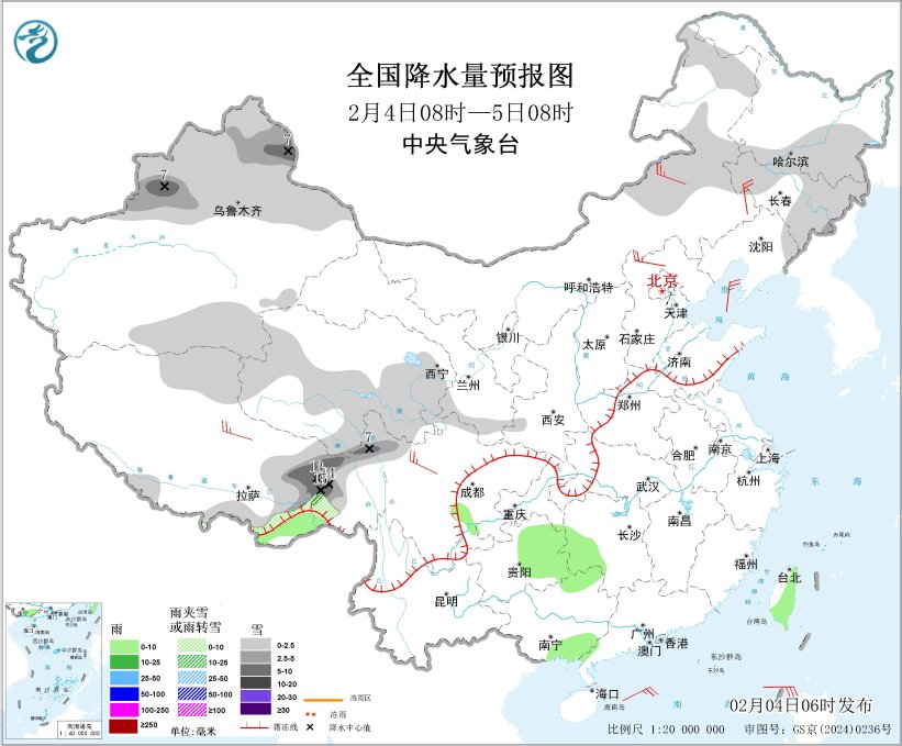 2月4日08時至5日08時,內(nèi)蒙古東北部、東北地區(qū)中東部、新疆北疆大部和南疆盆地東南部、西藏南部和東部、青海中南部、甘肅南部等地部分地區(qū)有小雪或雨夾雪,其中,新疆北疆東部和伊犁河谷、西藏東部等地部分地區(qū)有中到大雪,局地暴雪(10~15毫米)。四川盆地西南部、貴州東部、湖南西部、廣西東南部、廣東西南部、臺灣島大部等地部分地區(qū)有小雨。內(nèi)蒙古東南部和中部、河北北部、西藏北部、川西高原北部等地部分地區(qū)有4~5級風,陣風6~7級,南海東北部將有5~7級風、陣風8級。