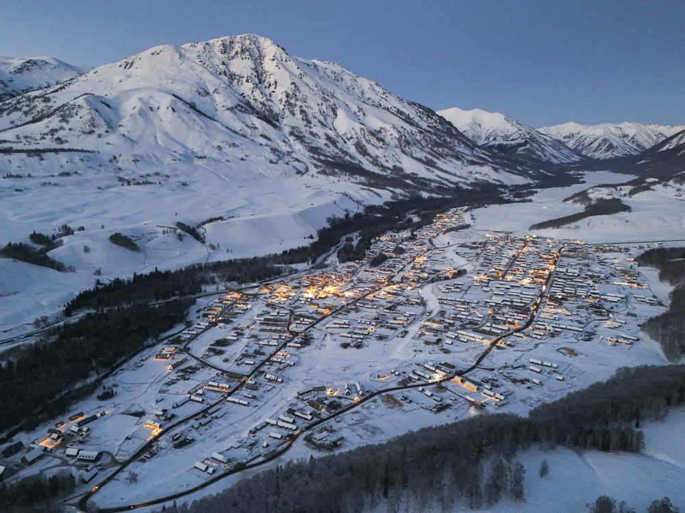夜幕降臨,新疆阿勒泰將軍山國際滑雪度假區(qū)即將開啟夜場運營(2025年1月24日攝,無人機照片)。新華社記者 胡虎虎 攝
