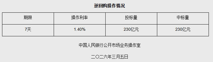 中國網(wǎng)3月5日訊 據(jù)央行網(wǎng)站消息,2026年3月5日中國人民銀行以固定利率、數(shù)量招標(biāo)方式開展了230億元7天期逆回購操作。具體情況如下: