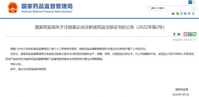 據(jù)國(guó)家藥監(jiān)局網(wǎng)站消息,國(guó)家藥品監(jiān)督管理局11日發(fā)布公告,決定自即日起停止蓮必治注射液在我國(guó)的生產(chǎn)、銷售、使用,注銷藥品注冊(cè)證書。已上市銷售的產(chǎn)品,由藥品上市許可持有人負(fù)責(zé)召回,召回產(chǎn)品由所在地省級(jí)藥品監(jiān)督管理部門監(jiān)督銷毀或者依法采取其他無(wú)害化處理等措施。