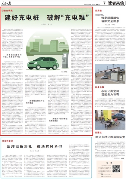 今年3月20日,《人民日?qǐng)?bào)》讀者來(lái)信版“金臺(tái)視線”欄目《建好充電樁 破解“充電難”》一文,在消費(fèi)者個(gè)人安裝新能源汽車充電樁方面,關(guān)注了多位“人民投訴”平臺(tái)用戶吐槽“物業(yè)不配合業(yè)主安裝充電樁以及個(gè)人充電樁的維護(hù)管理不到位”等問題。