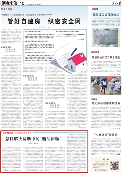 2022年6月6日,《人民日?qǐng)?bào)》讀者來(lái)信版“百姓關(guān)注”欄目《怎樣解決網(wǎng)購(gòu)中的“贈(zèng)品問題”》一文則關(guān)注了“人民投訴”平臺(tái)用戶“下單時(shí)頁(yè)面顯示有贈(zèng)品卻未收到,客服回應(yīng)是贈(zèng)品有限、隨機(jī)抽取買家”等線上商家的失信行為。