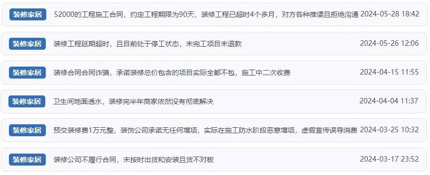 其實,有著同樣遭遇的消費者不在少數(shù)。公開報道顯示,今年以來有多個家裝機構分公司或經(jīng)銷商跑路,還有個別不良裝修公司在短時間內(nèi)聚收大量預付款后攜款跑路,給消費者帶來經(jīng)濟財產(chǎn)損失?!叭嗣裢对V”梳理發(fā)現(xiàn),除閉店跑路外,目前平臺上涉及家裝消費類的投訴問題多聚焦于——