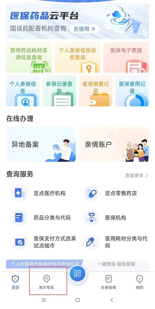 第一步:以北京為例,打開“國家醫(yī)保服務(wù)平臺”App,點擊進入下方“地方專區(qū)”,選擇“北京市”。