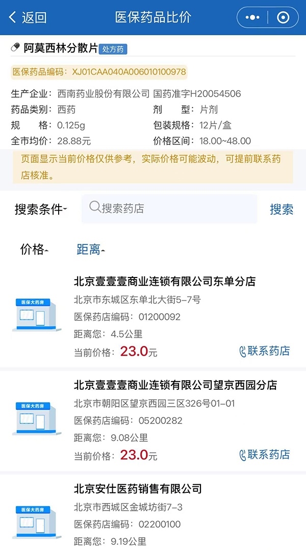 第五步:點擊“在售藥店”,即可看到按照距離遠(yuǎn)近、價格高低等維度排序的藥店信息。