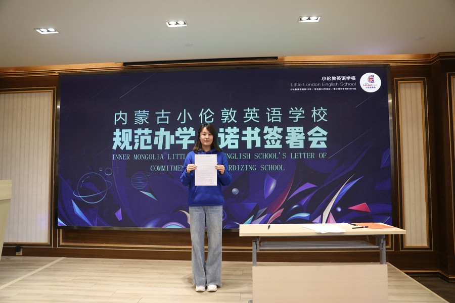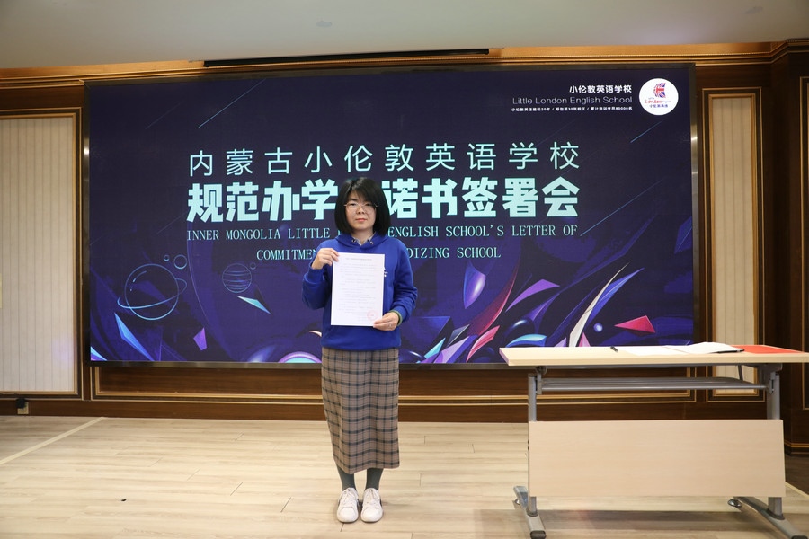 “堅(jiān)持黨的領(lǐng)導(dǎo),堅(jiān)持社會(huì)主義辦學(xué)方向,持證辦學(xué),依法辦學(xué)。以興趣培養(yǎng)為目標(biāo),推動(dòng)國(guó)際化人才的培養(yǎng)。堅(jiān)決推進(jìn)“減負(fù)”,不擅自提升學(xué)費(fèi),不在法定節(jié)假日安排授課。招生宣傳真實(shí)可信,杜絕夸大宣傳、虛假承諾、捆綁誘導(dǎo)、隱瞞欺詐等方式誤導(dǎo)學(xué)生及家長(zhǎng)的行為……”簽署會(huì)現(xiàn)場(chǎng),內(nèi)蒙古小倫敦英語學(xué)校副校長(zhǎng)尚燕云宣讀《內(nèi)蒙古小倫敦英語學(xué)校規(guī)范辦學(xué)承諾書》。