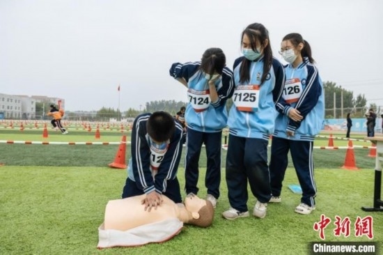在“紅氣球校園挑戰(zhàn)賽”上,學(xué)生參與完成骨折固定、海姆立克急救法、心肺復(fù)蘇等技能操作 中國(guó)紅基會(huì) 供圖