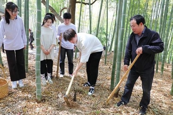 進(jìn)行40分鐘的“漫談式”課程后,師生們一起拿起鋤頭,開始挖筍實(shí)踐。在勞動(dòng)中,他們感受著春天的饋贈(zèng)。該校視覺傳達(dá)與設(shè)計(jì)專業(yè)的南通姑娘周雨濛從未嘗試過挖筍。對(duì)于校園中的竹子是何人養(yǎng)護(hù)、怎么養(yǎng)護(hù),她了解得不多。課堂上,她第一次拿起鋤頭,在學(xué)校校工的帶領(lǐng)下挖筍。