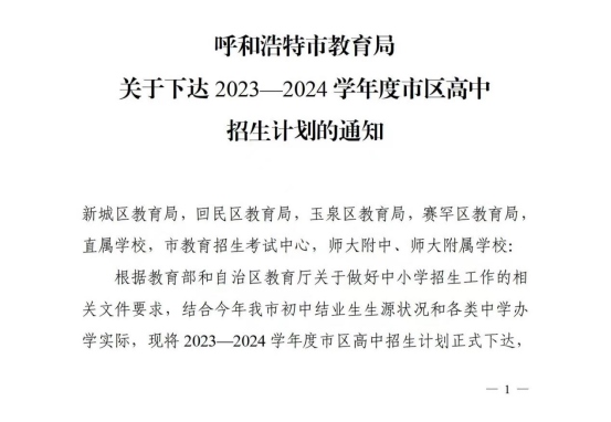 13日,呼和浩特市教育局發(fā)布2023-2024學年度市區(qū)高中招生計劃的通知,同時明確有關(guān)要求。