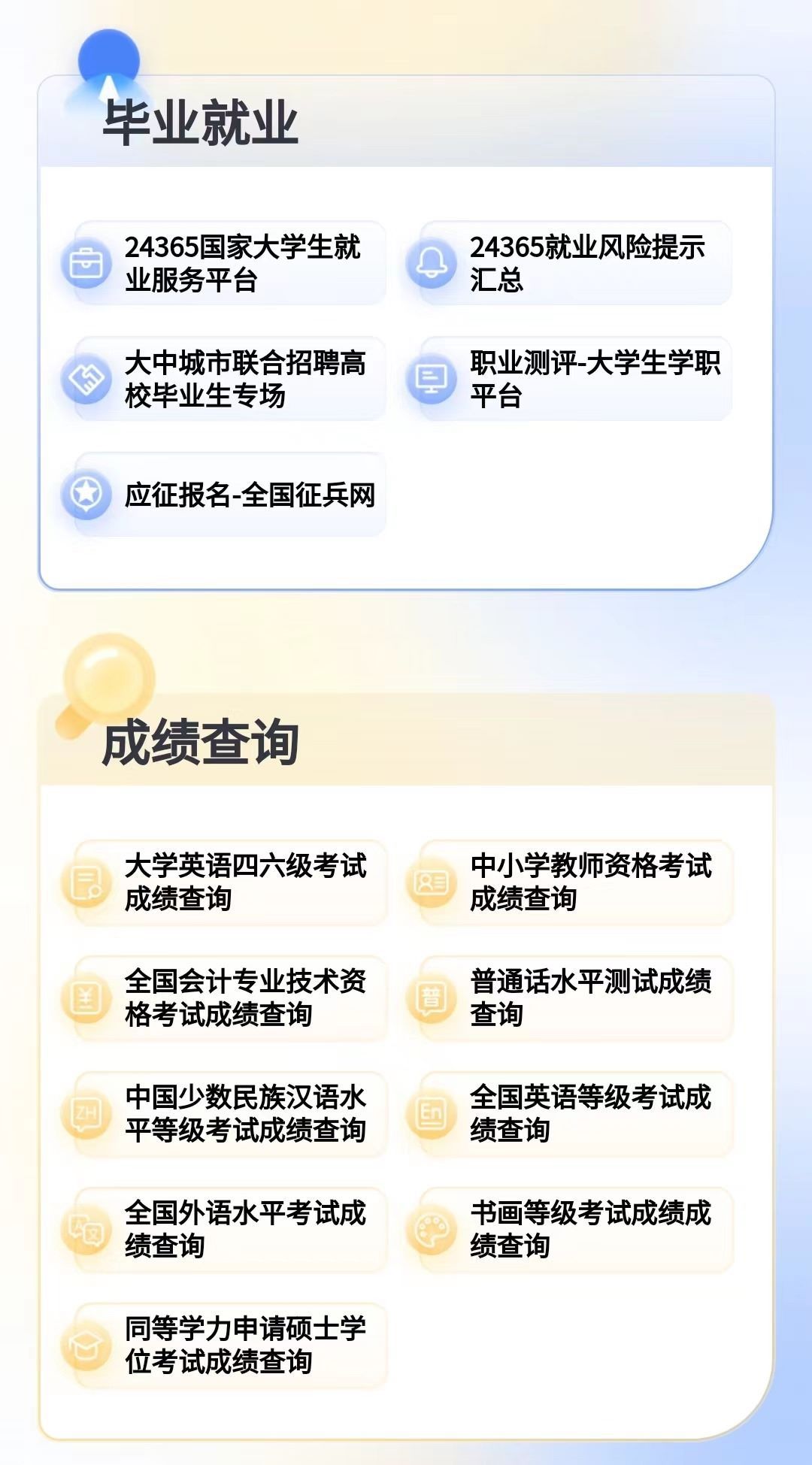 細(xì)分到大學(xué)生群體,“人民網(wǎng)+”客戶(hù)端便民服務(wù)匯總小程序提供在校期間多種國(guó)家考試成績(jī)的查詢(xún)服務(wù),并為大學(xué)生群體提供畢業(yè)就業(yè)資訊及服務(wù),實(shí)現(xiàn)從入學(xué)到就業(yè)“服務(wù)閉環(huán)”: