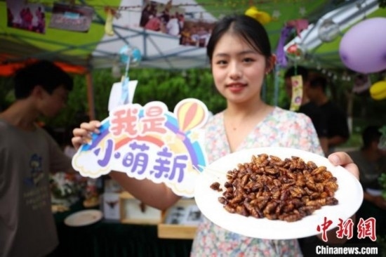 南京農(nóng)業(yè)大學植保學院志愿者展示可食用的昆蟲迎接新生。泱波 攝