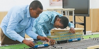 在位于吉布提首都吉布提市的吉布提工商學(xué)校,學(xué)生在魯班工坊鐵道運(yùn)營(yíng)沙盤(pán)教學(xué)區(qū)學(xué)習(xí)。 新華社發(fā) |