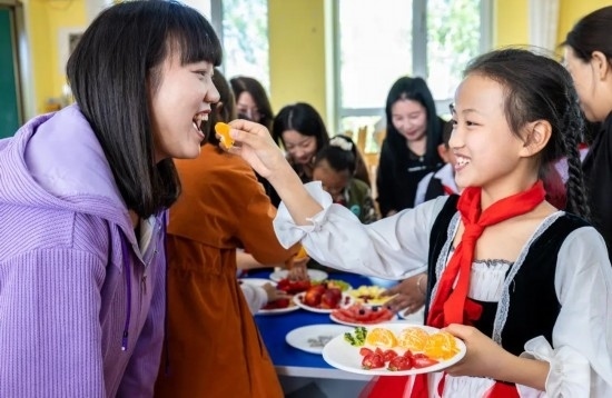 2023年5月12日,呼和浩特市玉泉區(qū)五塔寺東街小學學生請媽媽品嘗自己剛剛拼好的水果拼盤。通訊員 丁根厚 攝