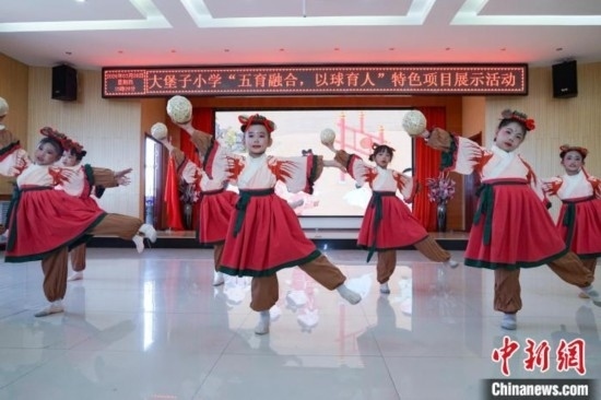 圖為在西寧市大堡子小學,學生展示“蹴鞠”舞蹈。馬銘言 攝