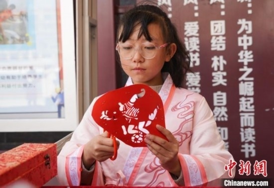 圖為在西寧市大堡子小學,學生正在裁剪融入足球文化的剪紙作品。馬銘言 攝