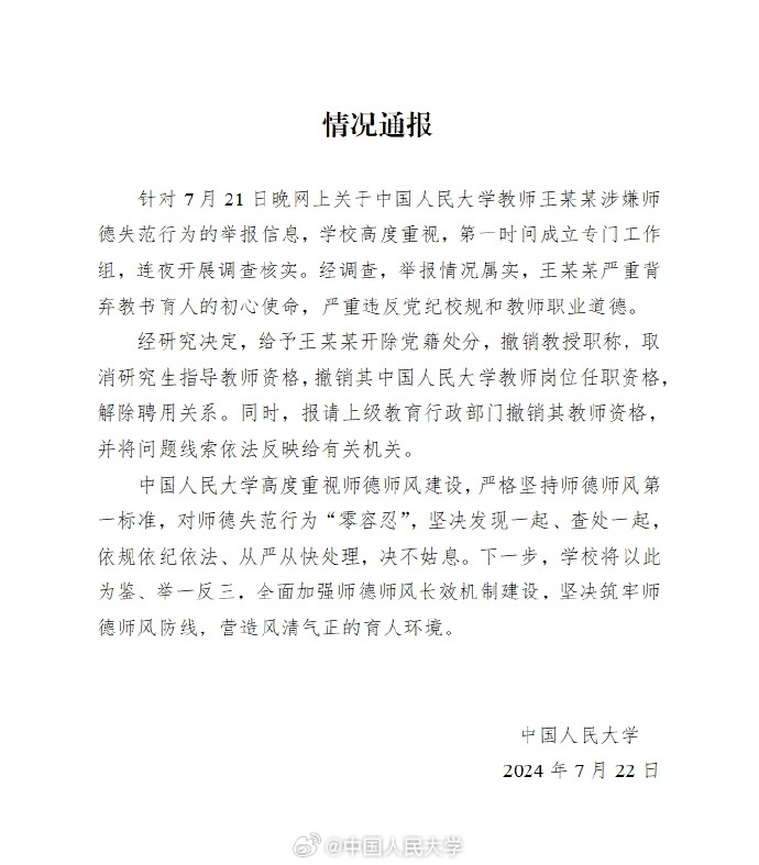 通報中稱,學校高度重視,第一時間成立專門工作組,連夜開展調(diào)查核實。經(jīng)研究決定,給予王某某開除黨籍處分,撤銷教授職稱,取消研究生指導教師資格,撤銷其中國人民大學教師崗位任職資格,解除聘用關(guān)系。同時,報請上級教育行政部門撤銷其教師資格,并將問題線索依法反映給有關(guān)機關(guān)。