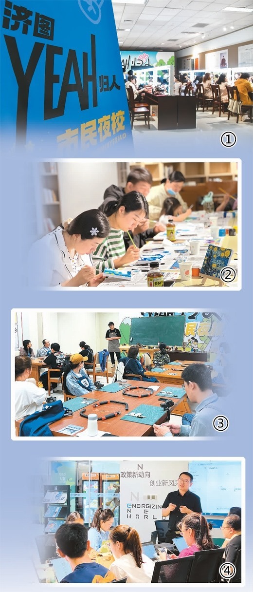 濟南“‘YEAH歸人’泉民夜?!痹谡n程設置、校區(qū)布局、師資配備等方面均進行了全面提升?!霸黾咏虒W點后,市民不僅能在專業(yè)機構(gòu)里上夜校,也能夠在家門口,在熱門文化‘新空間’里就近選擇自己心儀的課程?!睗鲜形幕^副館長張鈞善說。