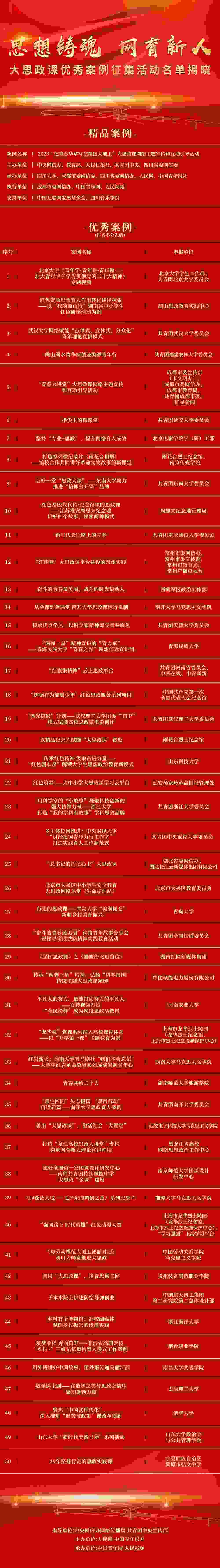 人民網(wǎng)北京2月10日電 (記者王鑫)由中央網(wǎng)信辦網(wǎng)絡(luò)傳播局、共青團(tuán)中央宣傳部指導(dǎo),人民網(wǎng)、中國青年報(bào)社共同主辦的“思想鑄魂 網(wǎng)育新人”大思政課優(yōu)秀案例征集活動(dòng)評(píng)選今天揭曉結(jié)果,經(jīng)初選、終選以及結(jié)果公示,產(chǎn)生精品案例1件、優(yōu)秀案例50件,名單如下: