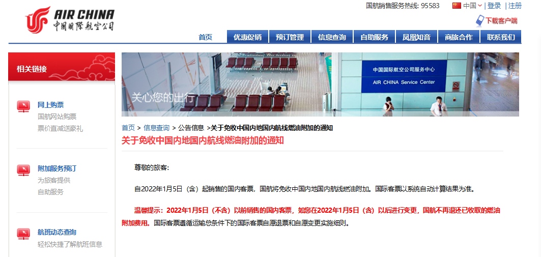 今日,中國(guó)國(guó)際航空、海南航空、天津航空、西部航空等多家航空公司發(fā)布通知,根據(jù)國(guó)家發(fā)展改革委、民航局的相關(guān)文件精神,自2022年1月5日零時(shí)起(出票日期),取消征收國(guó)內(nèi)航線燃油附加費(fèi)。