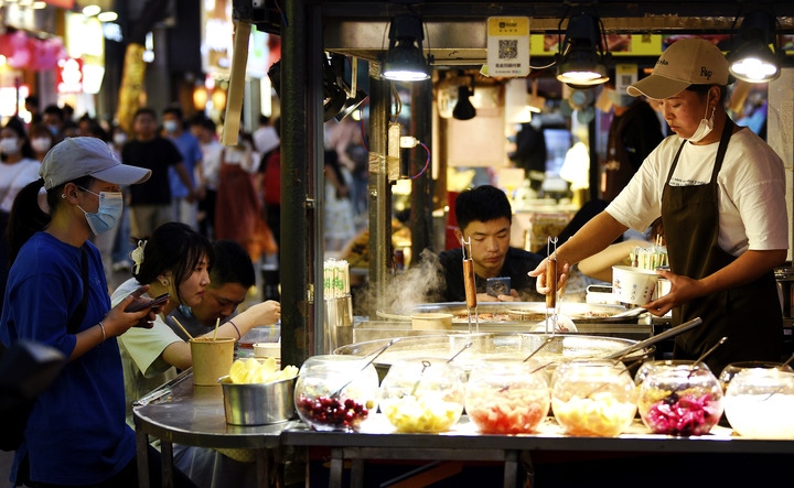 夜幕降臨,煙火升騰。位于陜西西安龍首村的紅街夜市香味四溢,來往游客摩肩接踵,一家陜北羊蹄攤前排滿了等候的食客。