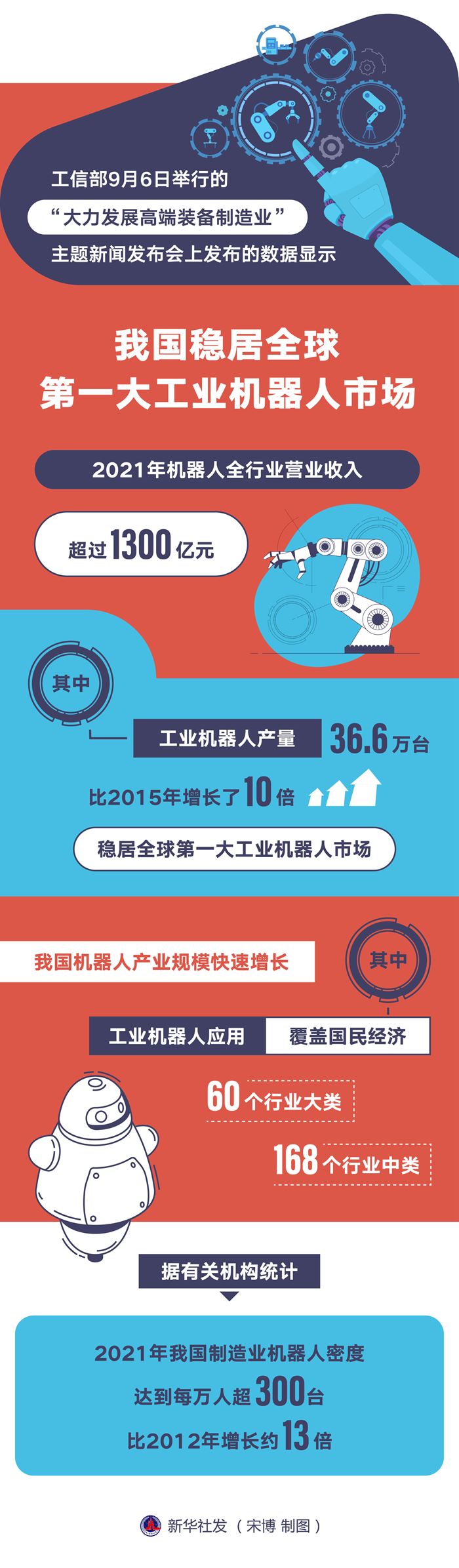 工信部裝備工業(yè)一司副司長(zhǎng)郭守剛6日表示,我國(guó)機(jī)器人產(chǎn)業(yè)規(guī)??焖僭鲩L(zhǎng),2021年機(jī)器人全行業(yè)營(yíng)業(yè)收入超過1300億元。其中,工業(yè)機(jī)器人產(chǎn)量達(dá)36.6萬(wàn)臺(tái),比2015年增長(zhǎng)了10倍,穩(wěn)居全球第一大工業(yè)機(jī)器人市場(chǎng)。