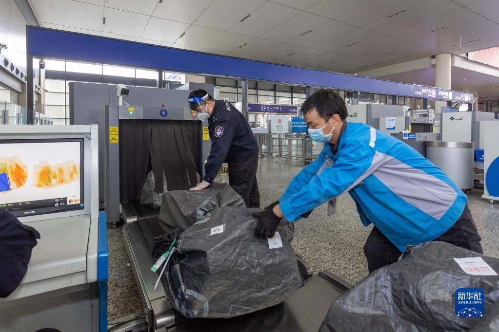11月1日,在上海虹橋站內(nèi)貨物專(zhuān)用安檢口,鐵路工作人員搬運(yùn)通過(guò)安檢的貨物。新華社記者 王翔 攝